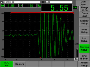 開發(fā)腐蝕模塊功能的目的是為進行基本腐蝕檢測的操作人員提供一種快速、簡便的解決方案。這個功能與多種業(yè)內(nèi)領(lǐng)先的Olympus雙晶探頭相兼容,其中包含D790探頭。選擇好適當?shù)奶筋^后,腐蝕模塊會對脈沖發(fā)生器/接收器的設(shè)置進行智能性調(diào)整,以保證得到超聲檢測的最佳效果。可以自動對測量閾限和增益進行調(diào)整,從而可使操作人員在極少動手調(diào)整設(shè)置的情況下立即得到厚度測量讀數(shù)。操作人員使用了這個功能后,就不再需要像以往一樣,為保持測量的穩(wěn)定性及避免幾何形狀發(fā)出的干擾性回波,而對閘門的起始、寬度和水平進行不斷地調(diào)整了。EPOCH 600腐蝕模塊功能還可以(簡便地)進行回波到回波測量。