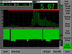 腐蝕模塊還包含一個時控B掃描視圖。這個B掃描的采集基于單個回波或來自回波到回波測量。B掃描可以為最多3個用戶定義的厚度范圍顯示彩色編碼。B掃描用于快速采集潛在缺陷區(qū)域的數(shù)據(jù)并制作綜合性報告。