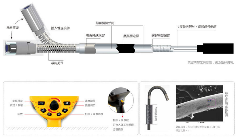 C50電控高清工業內窺鏡運用長距離信號傳輸及導向傳動技術,支持插入管7米,并且轉角可達120°,這一技術突破可以充分運用在管道、集箱或大型設備中。