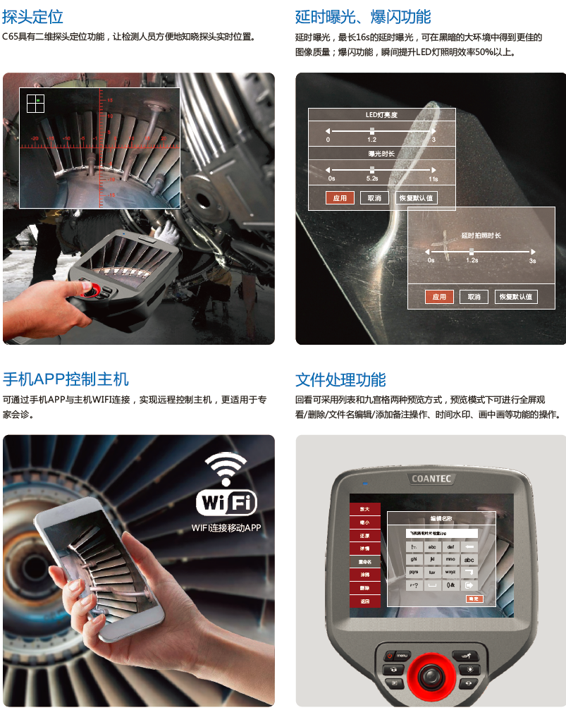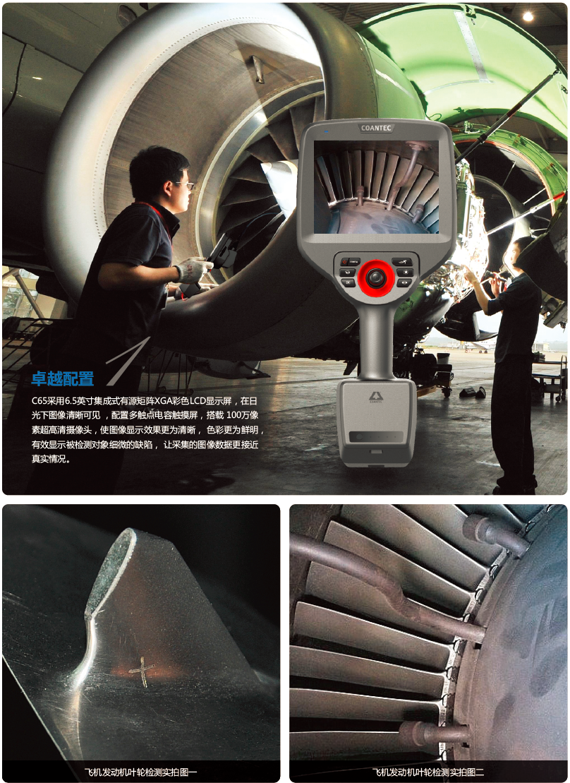 C65 采用6.5英寸集成式有源矩陣XGA彩色LCD顯示屏,在日光下圖像清晰可見 ,配置多觸點電容觸摸屏,搭載100萬像素超高清攝像頭,使圖像顯示效果更為清晰,色彩更為鮮明,有效顯示被檢測對象細微的缺陷,讓采集的圖像數據更接近真實情況。